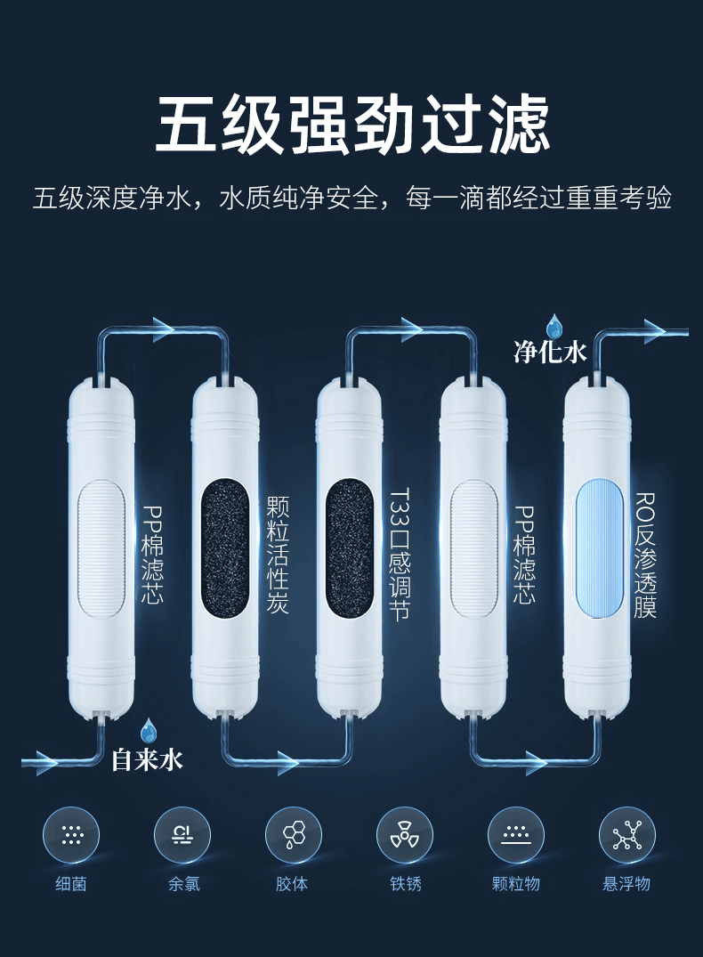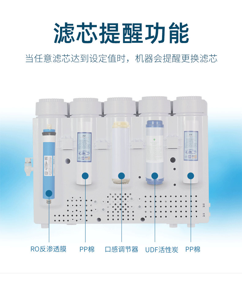 pp棉+颗粒活性碳+口感调节活性炭+pp棉+反渗透ro膜