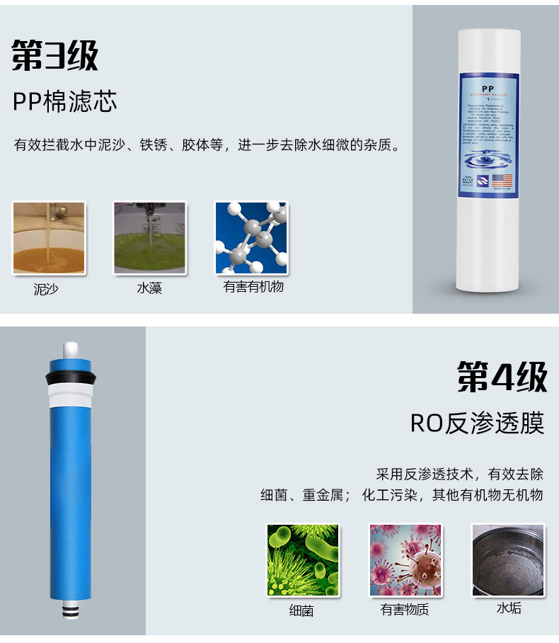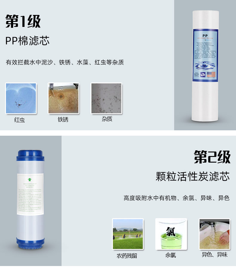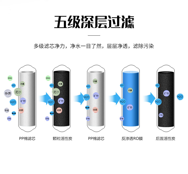 pp棉+颗粒活性碳+后置活性炭+pp棉+反渗透ro膜
